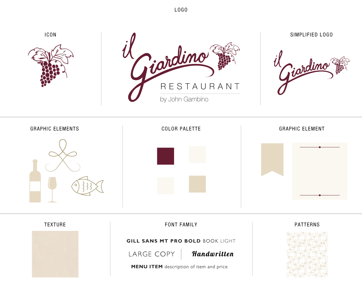 Brand system created for iL Giardino Restaurant Aquebogue. Custom font by Maria Gonzalez from Calligraphy, Art, and More